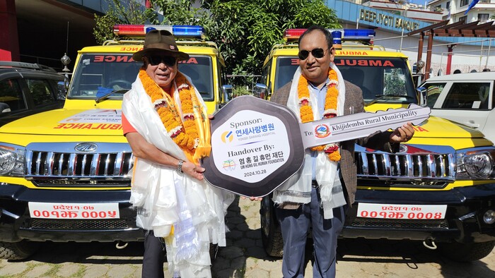 지난 28일(현지시간) 네팔 산골 도시인 키즈뎀바시에서는 연세사랑병원의 후원을 받아 앰뷸런스 2대의 전달식이 열렸다. 네팔 오지 지역의 열악한 의료 환경을 개선하기 위함이다. 연세사랑병원 고용곤 병원장은 지난 2023년에도 직접 네팔을 방문해 산악용 앰뷸런스를 기부한 바 있다.