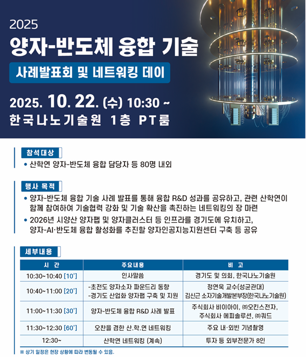 한국나노기술원이 주관하고 경기도·경기도의회가 주최하는 ‘양자-반도체 융합 기술 사례발표회 및 네트워킹 데이’ 행사는 ‘경기도 양자-반도체 융합산업 경쟁력 강화 사업’ 참여기업이 개발한 기술과 그 성과를 발표하고, 다른 기업들이 참고할 수 있도록 구체적인 방법론과 성과를 공유하는 네트워킹 장으로 활용할 예정이다.
