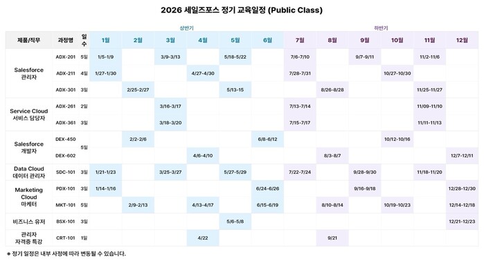 2026년에는 세일즈포스의 최신 트렌드와 산업 수요를 반영한 신규 과정들도 선보인다. 특히 Marketing Cloud(MKT-101) 과정은 고객 여정 설계, 세그멘테이션, 캠페인 실행 등 디지털 마케팅 전략을 실습 중심으로 학습할 수 있어 마케터와 CRM 운영자에게 높은 관심이 예상된다. 또한 Intelligent Service Cloud(ADX-361) 과정은 Salesforce AI를 기반으로 고객 상담 지원, 서비스 자동화, 데이터 분석 등 AI를 활용한 고객 서비스 운영 역량 강화를 목표로 하며, 특히 공식 커리큘럼 외에 실제 고객 서비스 환경에서 A.I가 어떻게 활용되는지 체감할 수 있는 Salesforce AI 기반 Enhanced Chat 데모 실습을 추가 제공한다. 이는 교육 운영 상황에 따라 시연 형태로 제공될 수 있다.