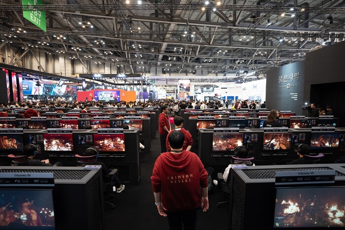붉은사막 전시관은 100여대의 게임 시연 PC와 사전 영상관으로 꾸몄다. 단일 게임으로는 최대 규모다. 주어진 시간 속 강렬한 재미를 경험할 수 있도록 ‘액션성‘과 전투에 집중한 시연 빌드를 마련했고, 국내 팬들을 위해 신규 보스 ‘헥세 마리’를 추가로 선보였다.