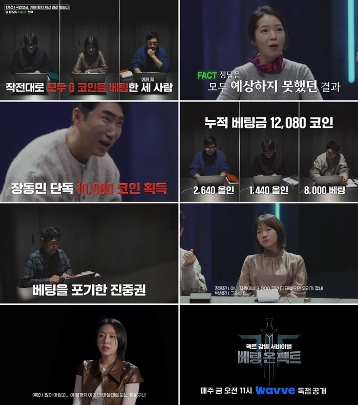 결과는 ‘팩트’였다. 모두의 작전이 무너진 가운데 장동민은 홀로 5000코인을 베팅해 2배인 1만 코인을 획득했다. 그는 뒤늦게 상황을 파악했다며 여유로운 미소를 보였고, 완벽한 연합을 꿈꿨던 플레이어들은 허탈한 웃음을 감추지 못했다.