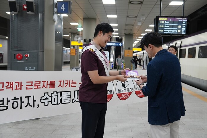 | ▲에스알은 11일 SRT 수서역에서 열차 승하차, 에스컬레이터 이용 시 수하물로 인한 근골격계 사고를 예방해 고객과 근로자를 지키기 위한 홍보 활동을 펼쳤다. |