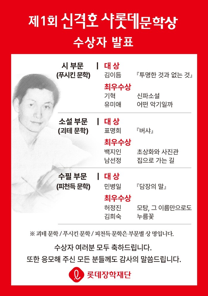 [메가경제=주영래 기자] 롯데장학재단(이사장 장혜선)은 지난달 31일(목) 롯데그룹 창업주 신격호 명예회장의 문학사랑을 기리는 의미에서 마련된 <제1회 신격호 샤롯데 문학상>의 수상자를 발표했다.