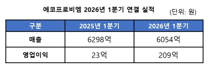 에코프로비엠은 1분기 연결 재무제표 기준 매출 6054억 원, 영업이익 209억 원을 기록했다. 매출은 전년 동기(6298억 원) 대비 소폭 줄었지만 영업이익은 같은 기간(23억 원)와 비교해 크게 늘며 수익성이 개선됐다.