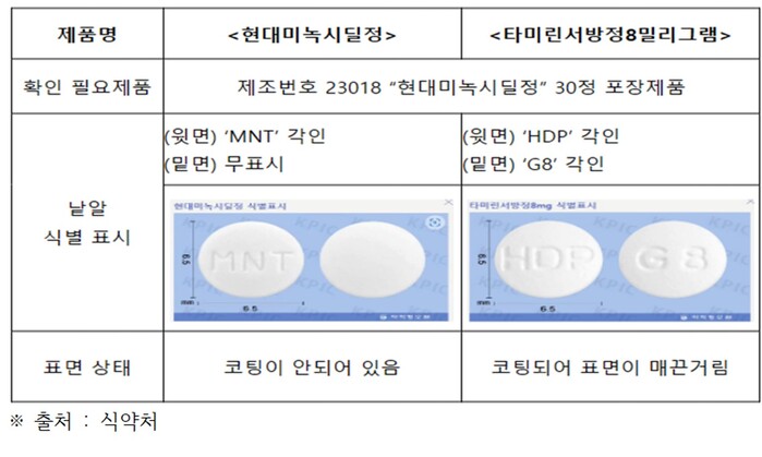 현대약품의 제품 혼입 사고가 발생한 치매약(타미린정)-고혈압약(현대미녹시딜정)을 비교하면, 두 약 모두 백색의 직경 6.5mm인 원형의 정제로 무심코 보면 구분하기 쉽지 않다. 약 표면에 새겨진 글자와 필름 코팅 유무로 구분이 가능하나, 소비자가 자세히 보지 않으면 잘못된 제품으로 인지하기는 매우 어렵다. 결국 소비자들은 모르고 약을 먹을 확률이 높다.
