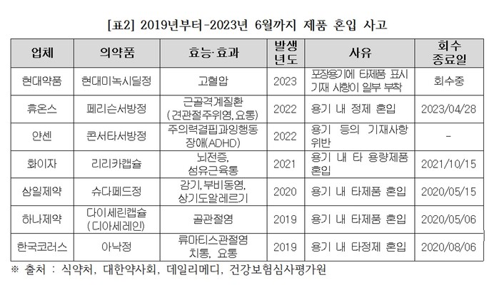 소비자주권시민회의는 2019년도부터 2023년 6월까지 식약처와 대한약사회의 자료를 토대로 의약품 제품혼입사고를 조사했다. 이 기간 총 7건 발생했다.