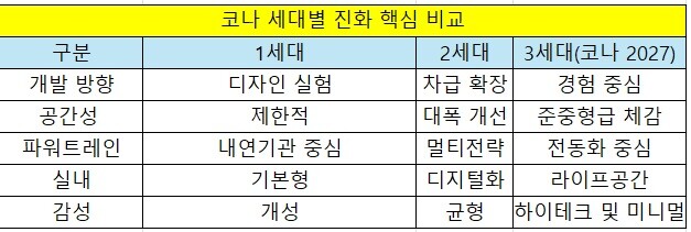 업계 관계자는 “코나의 진화는 단순한 모델 변경이 아니라 현대차의 전략 변화와 맞물려 있다”며 “소형 SUV 시장이 가격 중심 경쟁에서 벗어나 전동화, 소프트웨어, AI, 사용자 경험 중심으로 이동하는 흐름 속에서 코나는 가장 빠르게 변화를 반영한 모델”이라고 설명했다.