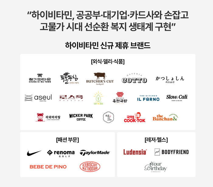 지난 5개월간 하이비타민과 새롭게 제휴한 주요 브랜드를 살펴보면, 외식 분야의 경우 청기와타운, 투뿔등심, 붓처스컷, 오스테리아 꼬또, 카츠쇼신, 어슬, 로스옥, 썬더버드, 육전국밥, 더 키친 일뽀르노, 다이닝원, 라와마라탕, 슬로우캘리, 위커파크, 지호한방삼계탕, 백년교동짬뽕, 추억의 국민학교 떡볶이, 더반찬 등이 있다. 레저·헬스 부문은 루덴시아, 바디프랜드, 패션 부문은 윈윈스포츠(나이키), 레노마골프, 오닐, 테일러메이드 어패럴, 베베드피노, 아이스비스킷 등이 추가됐다. 기념일 꽃·기프트 전문 브랜드 유어버스데이도 합류하며 복지 영역을 넓히고 있다.