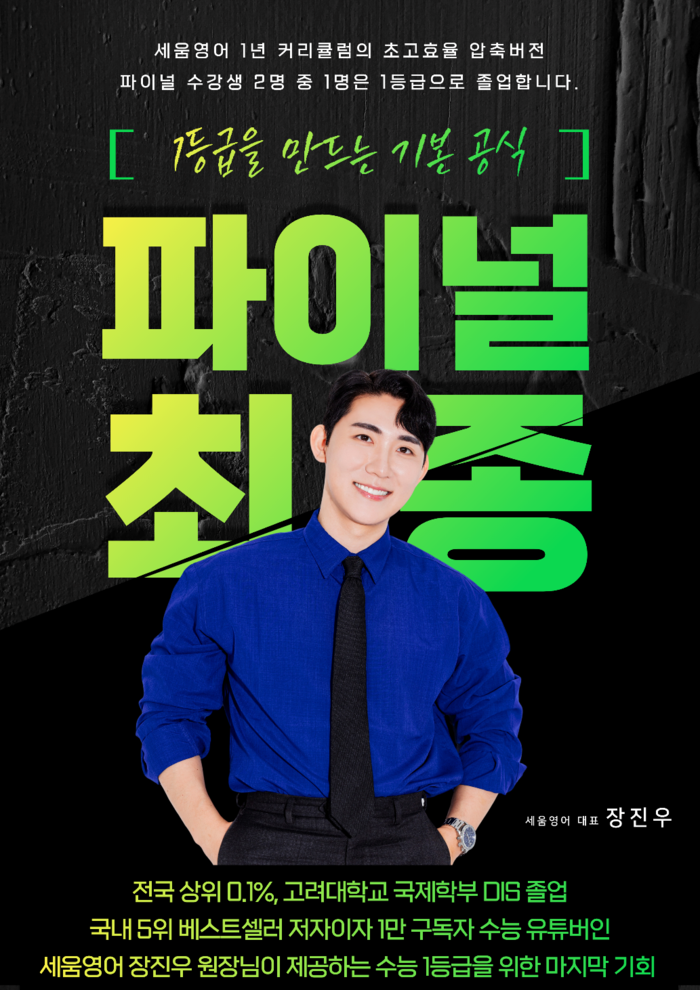 장진우 원장은 고려대학교 국제학부(DIS) 출신 언어·논리 분석 전문가로서 학생의 사고 패턴을 △인과형 △병렬형 △전환형 △배제형 △함축형 △확장형 △축소형으로 구분해 각 패턴에 최적화된 솔루션만 투입한다. 덕분에 “문제를 푸는 게 아니라 출제 의도를 읽는 수준” 이라는 반응이 상위권에서 나오고 있다.