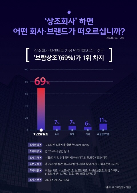 21일 시장조사 전문기관 마크로밀엠브레인에 따르면 지난 2월 3주간 서울, 경기 및 6대 지역(5대 지방광역시+제주[메가경제=이준 기자] [메가경제=이준 기자] 의 만20세~69세 성인 남녀 2,420여명을 대상으로 상조서비스에 대한 인식 및 브랜드 인지도 등의 내용으로 온라인 설문을 실시한 결과 설문자 중69%가 가장 먼저 떠오르는 브랜드(최초상기도, TOM)로 보람상조를 꼽았다.