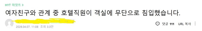 누리꾼들 사이에서도 호텔 측의 조치에 비난을 쏟아냈다. 한 누리꾼은 “누가봐도 고의라고 생각한다. 노크 후 응답이 없는데 들어가는건 문제가 있다”고 꼬집었다.