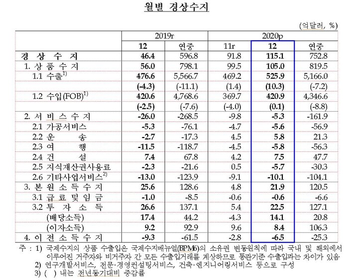 12월만 놓고 보면, 경상수지는 115억1000만달러(약 12조8천739억원) 흑자였다. 지난해 5월 이후 8개월 연속 흑자일 뿐 아니라 2019년 12월의 약 2.5배 규모다.