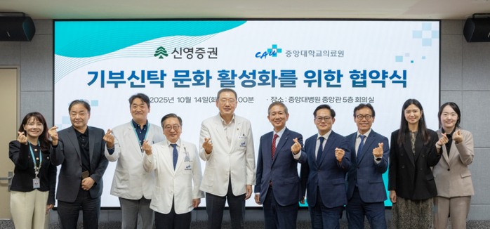 이번 협약은 신영증권과 중앙대학교의료원이 기부 신탁을 포함한 다양한 교류와 협력을 통해 기부 문화 활성화는 물론, 지속 가능한 사회적 가치 창출을 도모하기 위한 전략적 파트너십의 일환으로 마련됐다.