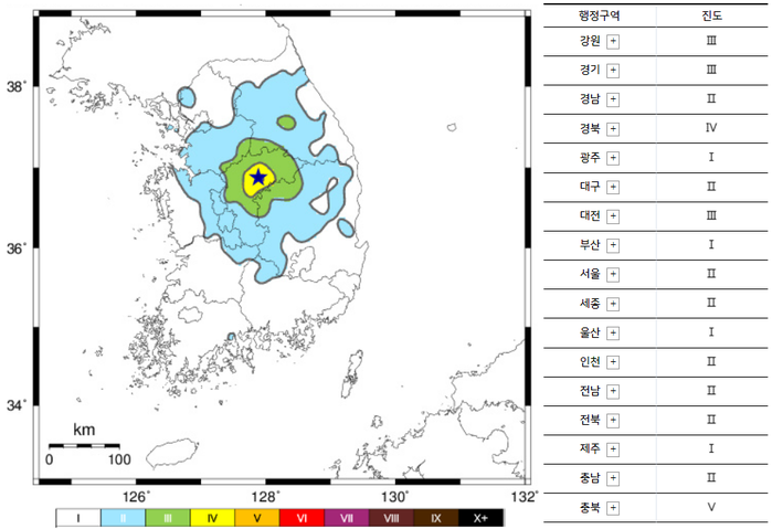 계기진도 5는 ‘거의 모든 사람이 진동을 느끼고 그릇과 창문 등이 깨지기도 하며 불안정한 물체는 넘어지는 수준’을, 4는 ‘실내 많은 사람이 느끼고 일부가 잠에서 깨며 그릇과 창문 등이 흔들리는 정도’를, 3은 ‘실내에서 건물 위층에 있는 사람이 현저히 느끼며 정지한 차가 약간 흔들리는 정도’를, 2는 '조용한 상태나 건물 위층에 있는 소수의 사람난 느끼는 정도'이다.