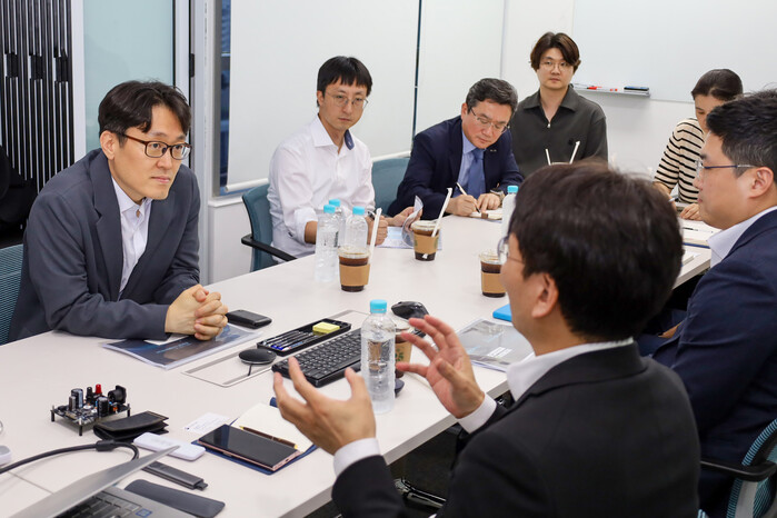 | ▲ 김봉덕 중소벤처기업부 벤처정책관과 기보 직원들이 시스템반도체 기업 아이언디바이스를 방문해 애로사항을 듣고 있다. [사진=기술보증기금] |