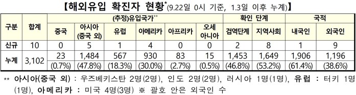 신규 확진자 중 국내발생은 51명이 확진됐고, 해외유입 사례는 10명이 확인됐다. 총 해외유입 누적 확진자수는 3102명이다.
