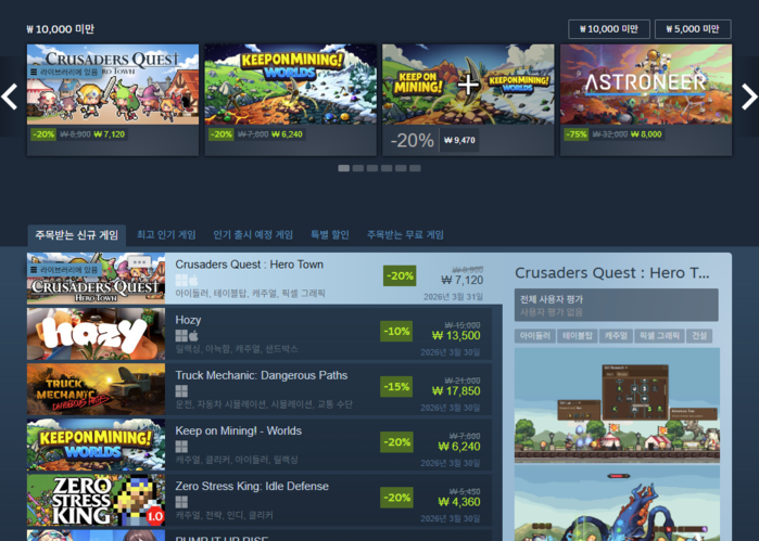 출시 직후 ‘주목받는 신규 게임’ 1위에 오르며 높은 관심을 입증하고 있다. 히어로 타운은 출시 전부터 뜨거운 기대를 모았다. 스팀 ‘인기 출시 예정 게임’ 차트에서 1위를 기록했으며, 릴리즈 트레일러는 공개 3일 만에 유튜브 조회수 5만 회를 돌파했다. 이는 크루세이더 퀘스트 IP의 견고한 팬덤과 데스크톱 방치형 RPG 장르에 대한 시장의 높은 관심을 동시에 보여주는 성과로 평가된다.