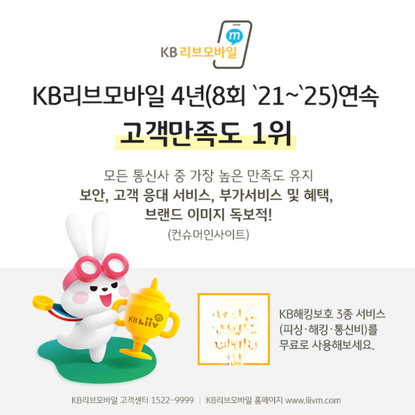 한편 KB리브모바일은 정보 보호 강화에 대한 고객들의 니즈에 부응하고자, 차별화된 보안 서비스인 ‘해킹보호 3종 서비스’를 무료로 제공하고 있다. 오는 26일부터 클릭 한 번으로 ‘해킹보호 3종 서비스’에 간편하게 가입할 수 있도록 절차가 개선된다.