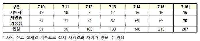 전날 사망자 중 80세 이상과 70대가 각각 9명(56.2%)과 4명(25.0%)으로 대부분을 차지했고, 50대는 1명이었다.