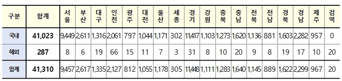 신규 확진자 중 국내 지역발생(국내감염) 사례는 4만1023명이고 해외유입 사례는 287명이다.