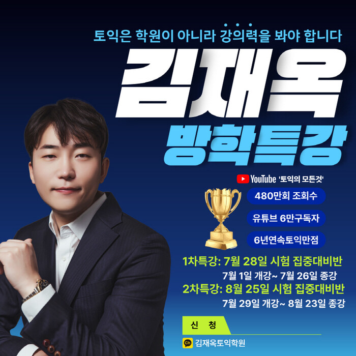 저녁에만 시간이 되는 직장인 수강생의 경우 방학 특강 전 마지막 저녁 강의 가능한 6월 강의도 진행되며 부득이 현장수업을 듣지 못하는 수강생을 위해서 김재옥토익 온라인 강의도 운영돼 자신에게 맞는 강의를 선택할 수 있다. 매해 전 좌석이 마감되는 2024년도 여름방학 7월, 8월 특강은 5월부터 사전등록이 시작되며, 빠른 마감으로 좌석 선점이 필수라는 설명이다. 자세한 사항은 김재옥토익학원 홈페이지를 통해 확인 가능하다.