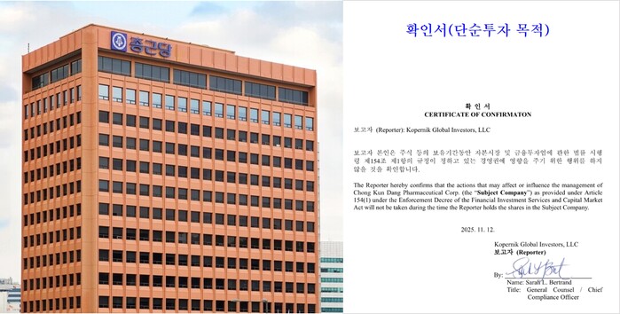 금융감독원 전자공시에 따르면 코페르닉은 자본시장법상 지분 5% 이상 보유 시 공시 의무에 따라 종근당 주식 취득 사실을 신고했다. 경영권 참여 목적이 아닌 재무적 투자자로서 투자한 것으로 파악됐다.