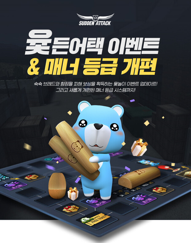 더불어, 5월 9일까지 ‘서든어택’ 마스코트 캐릭터 ‘브레드’와 윷놀이 대결을 펼치고 ‘윷 캐릭터 세트(영구제)’, ‘[M]Peacemaker Marble_Lv.1(30일)’ 등의 보상을 획득할 수 있는 ‘윷든어택’ 이벤트를 진행한다. 접속, 플레이 등의 미션을 수행해 던지기 기회를 획득할 수 있으며 친구와 함께 플레이하거나 주말, PC방 접속 시 기회를 추가로 제공한다. 또, 친구가 게임에 접속하면 자신의 쉴드 게이지가 충전되어 함정과 ‘브레드’ 방어에 사용할 수 있는 쉴드를 획득할 수 있다.