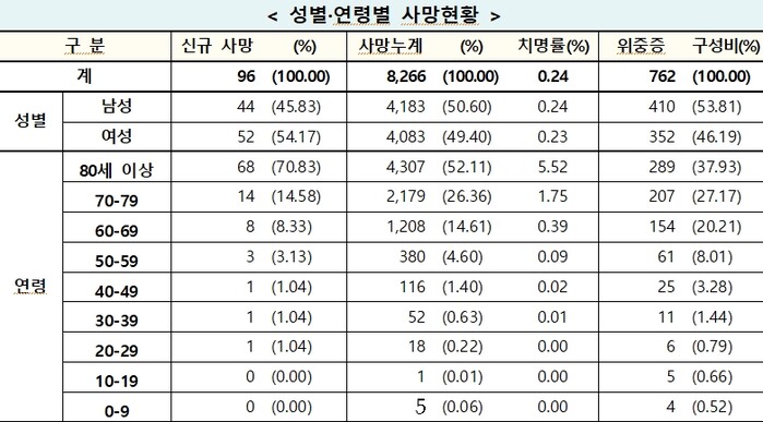 전날 사망자를 연령별로 보면, 80세 이상이 68명으로 70.83%를 차지했고, 이어 70대 14명, 60대 8명, 50대 3명이었다. 20대와 30대, 40대는 각각 1명이었다.