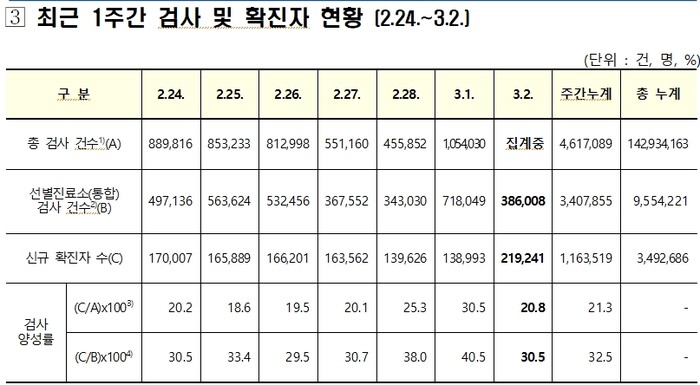 중앙방역대책본부는 2일 0시 기준으로 신규 확진자가 21만9241명 발생해 지금까지 누적 349만2686명으로 집계됐다고 밝혔다. 해외유입 누적은 2만9444명이다.