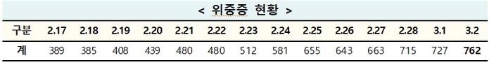 지난달 18일(385명) 다음날부터 400명대로 올라선 뒤 가파르게 늘어 12일만에 두 배 가까이 증가했다.