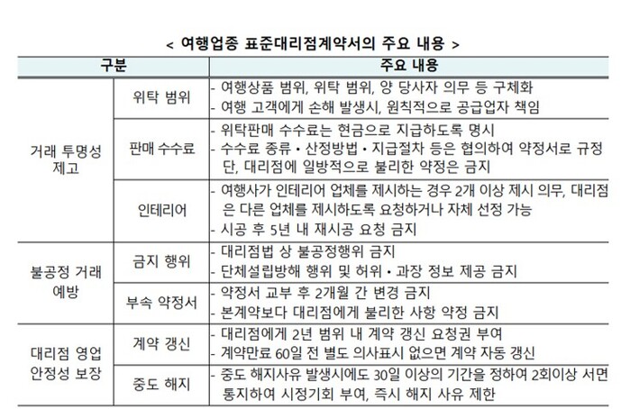 표준계약서에는 ▲여행상품 위탁 범위 및 의무사항 명확화, ▲현금 기반 판매수수료 지급 원칙, ▲인테리어 업체 선정 권한 보장, ▲불공정 거래 금지, ▲계약 갱신 및 중도 해지 제한 등 총 21개조 68개항이 포함됐다. 특히, 여행사의 업무상 소비자 피해 발생 시 배상책임을 명확히 규정해 대리점 권익을 보호하도록 했다.