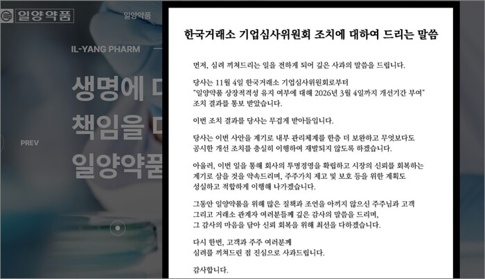 현재 일양약품은 주식 거래가 정지된 상태이며, 한국거래소의 상장적격성 실질심사 대상으로 지정돼 있다. 한국거래소 기업심사위원회는 회사에 2026년 3월4일까지 약 4개월의 개선기간을 부여하고 내부통제 보완 등 구체적 계획 이행을 요구한 상황이다.