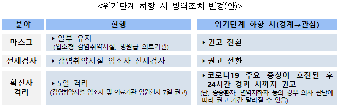 | ▲ 위기단계 하향 시 방역조치 변경 내용. [질병관리청 제공] |