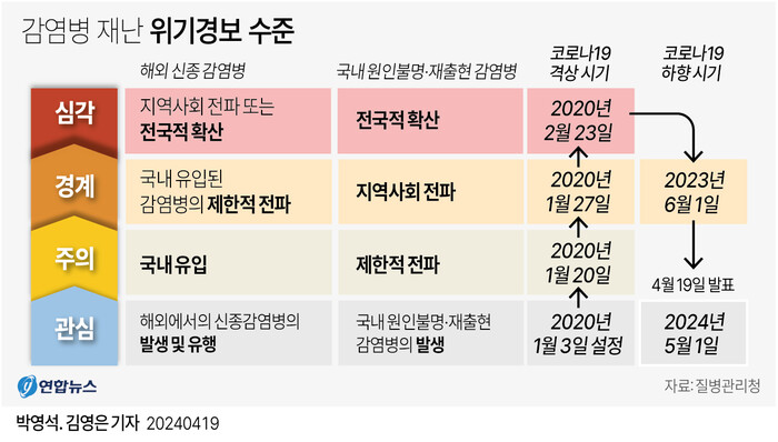 | ▲ 감염병 재난 위기경보 수준. [그래픽=연합뉴스] |
