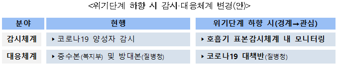 | ▲ 위기단계 하향시 감시체계와 대응체계 변경 내용. [질병관리청 제공] |
