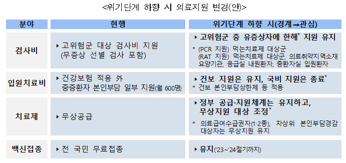 | ▲ 위기단계 햐향 시 의료지원 변경 내용. [질병관리청 제공] |