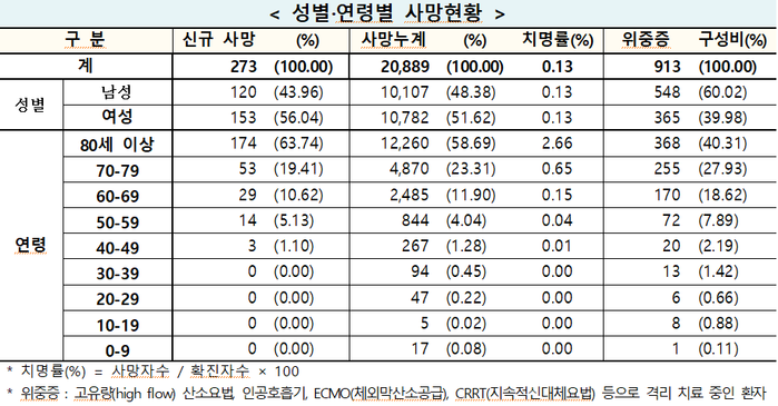 코로나19 누적 사망자는 2만889명이고 누적 치명률은 0.13%다.