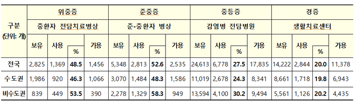 중증에서 상태가 호전되거나 중증으로 악화할 가능성이 높은 환자를 치료하는 준·중환자(준중증) 병상 가동률은 52.6%(5348개 중 2813개 사용)로 집계됐다.