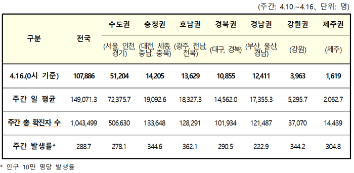 ▲ 16일 0시 기준 코로나19 권역별 확진자 현황. [중앙방역대책본부 제공] |