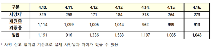 전날 위중증 환자는 913명으로 전날(999명)보다 86명 적으며 사흘째 900명대를 기록했다. 지난달 31일(1315명)을 정점으로 점차 감소세로 돌아서 14일부터는 1천명 아래로 줄어든 상태다.