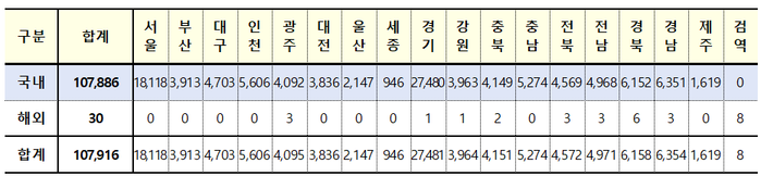 신규 확진자를 감염경로별로 보면 지역발생(국내감염)은 10만7886명이고 해외유입은 30명이다.