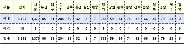 신규 확진자 중 전국 곳곳에서 발생한 국내발생(이하 지역발생)은 3194명이고 해외유입은 18명이다. 지역발생은 전날보다 183명이 늘었으나 해외유입은 5명이 줄었다.
