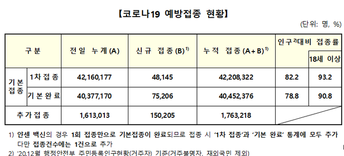 또 1차와 2차 접종을 완료한 기본완료접종자는 하루 새 7만5206명이 추가돼 누적 4045만2376명으로 인구 대비 접종률은 78.8%로 집계됐다.