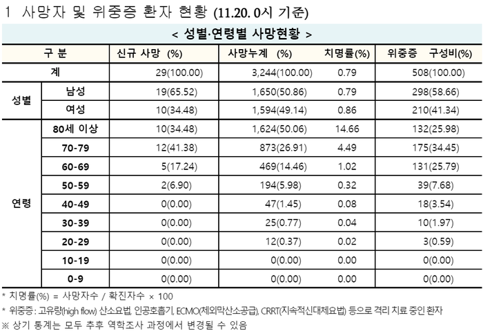 사망자 수도 하루 29명이 늘면서 전날(28명)에 이어 이틀연속 20명대 후반을 기록했다. 위드 코로나가 시작된 11월 들어 386명, 하루 평균 19.3명의 사망자가 나온 셈이다.