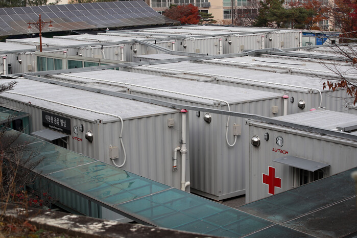 ▲ 수도권에 코로나19 확산세가 지속됨에 따라 중환자 병상 부족 현상이 우려되는 가운데 19일 서울 은평구 서울시립서북병원 주차장에 위중증 환자 급증에 대비한 '이동형 음압 병실'이 설치돼 있다. [연합뉴스] |