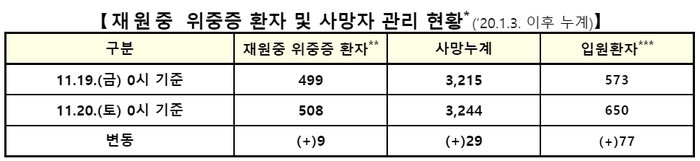 위드 코로나가 시작되기 전인 10월 31일 집계 332명보다 176명이나 많은 숫자다. 그만큼 중환자 병상에 대한 압박이 가중되고 있다.