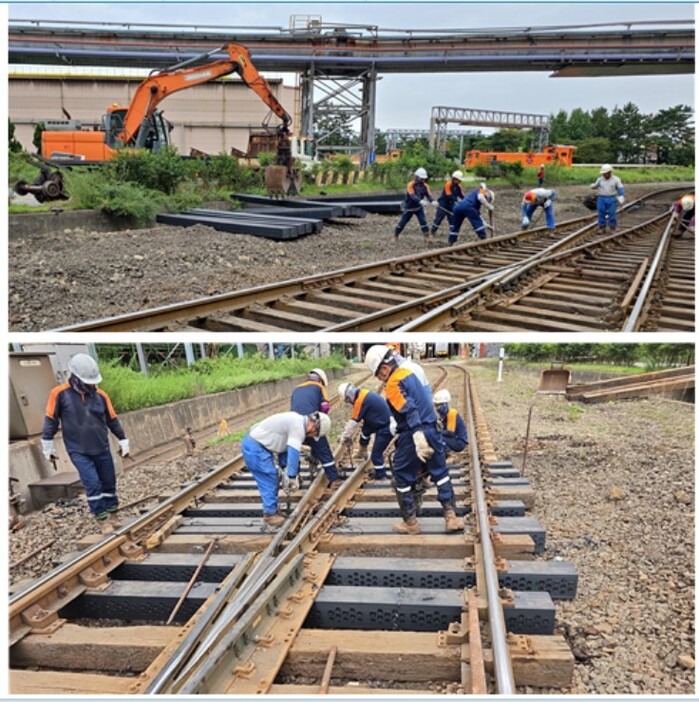 ▲ 기존 목재 침목을 대체하여 설치 중인 슬라스틱 침목(포항제철소 TLC 운행구간 분기기) |