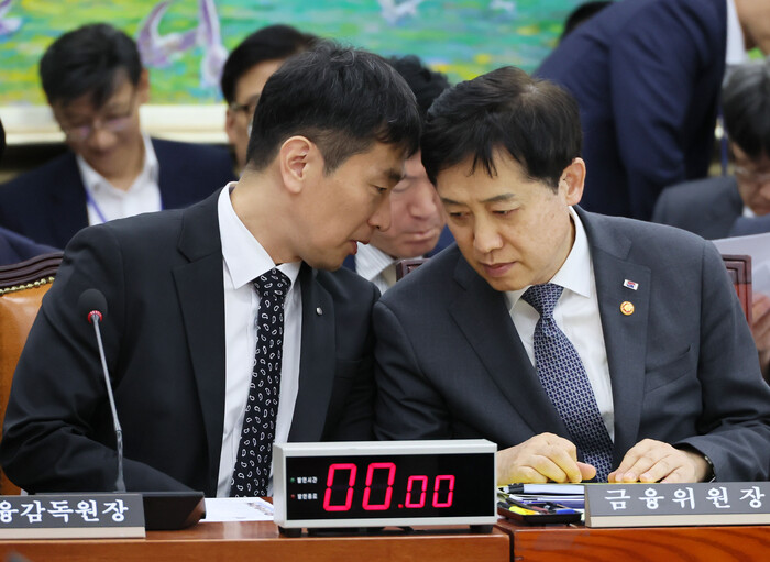 | ▲올해 국회 정무위원회 국정감사가 오는 11일 금융위원회를 시작으로 본격화되면서 라임펀드 특혜환매 의혹을 비롯한 쟁점이 부상하고 있다. 이복현 금융감독원장과 김주현 금융위원장이 지난 6월 국회에 출석해 서로 대화를 나누고 있다. [사진=연합뉴스] |