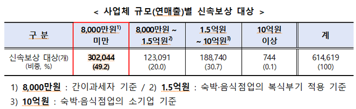 사업체 규모별로는 간이과세 대상에 해당하는 연매출 8천만원 미만 영세 사업체가 30만개사로, 전체 신속보상 대상 62만 개사 중 거의 절반(49.2%)을 차지한다.