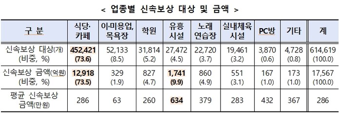 업종별 평균 최고액 유흥시설 634만원...상한액 1억원 지급 330개사